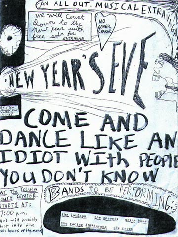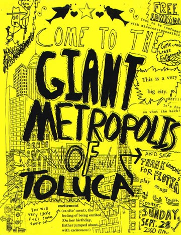 As its location would allude to, this was the first Toluca youth center show. Lots of friends from school attended. Strange to have a show on Sunday afternoon at 2 pm, no? About 3 sets were played, with breaks of varying length between them. People were amused. Nothing like that had ever been put on locally. Due to Mike’s overzealousness and lack of experience in the matter of flyer making, some people thought the name of the band was “THE GIANT METROPOLIS OF TOLUCA”. In addition, for some reason, some people interpreted the flyer to be advertising a history lecture. This was not due to Mike’s manic compulsive primitive flyer creating practices though; this was probably just due to stupendous wackimonzola copious fume inhalation.