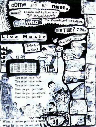 Like communism, this idea looked good on paper –and was real nice conceptually: Mike & Shawn(r tape, etc.) get a special section of the area where the festival was taking place to display their art, the Lotkaps play a set, the Racing Pisshorses play a set, and the Mayonnaise (Shawn & Mike) is the opening group. Sounded pretty fancy and artsy-like to Mike. Within the first 2 minutes of the Mayonnaise’s two song set, 90% of the crowd promptly exited the building. A tape player was set up at each side of the stage, playing daytime outdoor sounds (birds, cars, people) at high volume. Mike was making reverb noises with a guitar. Shawn was making heavily reverbed, high-pitched screeching noises with a bass at high volume. Why would people stay?...yet, why would they leave? About 6 people stayed through the Mayonnaise for The Racing Pisshorses’ set. JJ was mighty p.o.’d at Mike for having induced such a non-quantity of spectators at this, the Racing Pisshorses’ last show before JJ was to take off for Europe for 3 months –thought of then as possibly the Pisshorses’ last show. The Lotkaps played last to a crowd of less than 7 but more than 3 people. Not only did not many people come to see the music happen, not many people came to the damn midstate art conference. A hot, very weird, quiet, long day. It’s seems sometimes that it is a rare thing to find people who are excited about creativity. There is no shortage, however, of people who like eating donuts, decorating with tacky wallpaper, and watching mtv. read the pisshorse take on this show