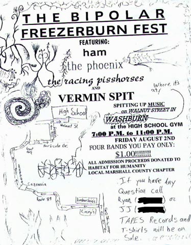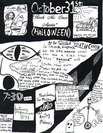 we didn't rehearse for this show, but JJ decided we should play a Jimi Hendrix medly of songs no one else knew. chaos of the day ruled. wasn't this a birthday party or something? (the phoenix didn't actually play at this show. neither did the racing pisshorses. the show we were just talking about was actually some bizarre birthday party at the minonk VFW. but, we liked that show, so we thought this was a good excuse to write something about it. in fact, it was the first show we ever got paid for: $20. to find out what this show was really about, click here.)