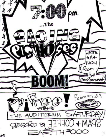 this flyer is from our second show the summer of 2001, at the PCW in Spring Valley. played this new medley of amorphous bathing and an unreleased tune, "lawnmower." we were moving from tuning in between songs for decades (like we did at the first Zarathustra) to starting the next song before stopping the first. for our third show that summer, we finally did just that, playing our 12 song set in 45 minutes with just one interruption. unfortunately, JJ had to go back to school. our first show that summer was also at the PCW wrestling place, only that time we actually played in the wrestling wring in 100 degree temperatures. it was so much fun, but there was no ground for the mic so JJ kept getting some lip-shock. finally he put a stocking hat over the stupid thing, taking the shock away but adding to the heat. lotta sweaty fun, though. as far as we know, this was cory's first show with the pisshorses. more from the rebekahs tape part of the show.