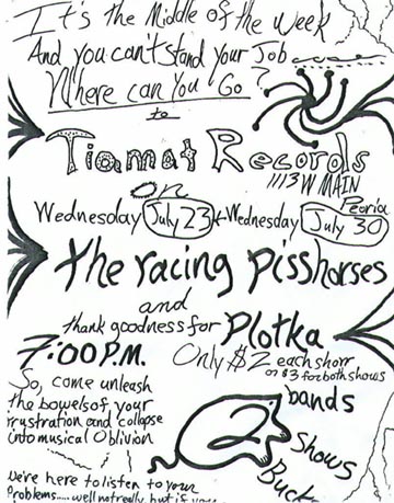 this flyer is from the biennial Zarathustra festival. of course, it only happened twice, but... anyways, we had a lot of cool art on display here, from Jenny Pietz's stunning b&W photographs, to aldo quintanar's paintings to stuff from all of us here at what is now intangible cat. nobody came really, but that's happened a lot over the years. the pisshorse show was pretty awesome, it was our third (and maybe last?) show with randy on bass. aldo joined us on a second drum set. probably the highlight was "see my life" and a new song that we made up there.... more on this show from rebekahs tape.