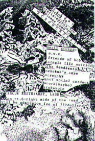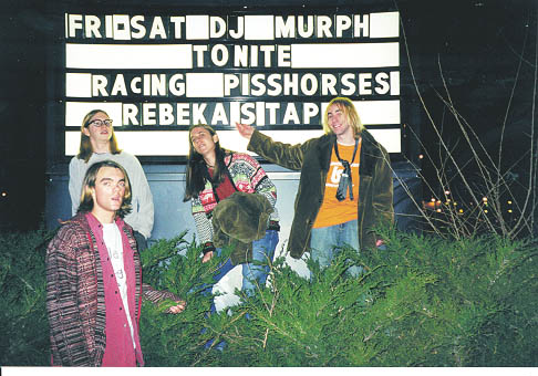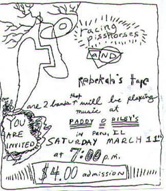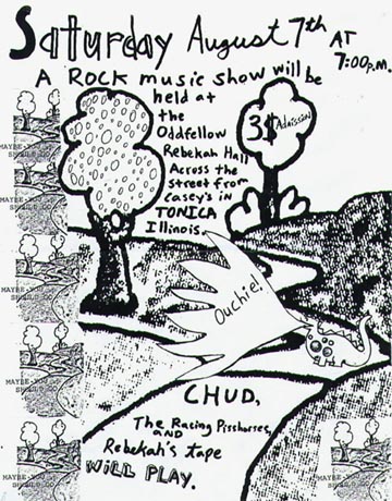 The first show rebekah’s tape and the racing pisshorses played up near La Salle/Peru. A lot of things from “is Happy Happy Haps” were played, and a lot of the same covers played at the Toluca Youth Center were played…with a few different not-worth-specifying covers added. “Barn” was the newest song of our own being played. The main ‘lineups’ of rebekah’s tape had two forms at this time: Randy/Mike/Dustin and Mike/Shawn/Dustin. Randy/Mike/Dustin played a lot of covers, a few songs Randy had made, and “Barn”. Mike/Shawn/Dustin played the “is Happy Happy Haps” stuff. It was fun. Cory was then the bass player for Chud, and Nate Zack (presently a member of Fetal Genius) was the drummer. Our friend Erica was also in that band. They broke up just a few months after this show. Mike wrote “BOBBY” on several people’s arms and also succeeded in burning a doll on the front sidewalk. more on this show from a pisshorse perspective