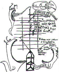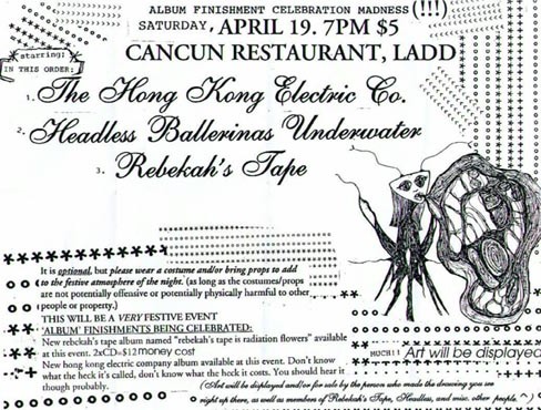 : “Rebekah’s Tape is Radiation Flowers/Professionalism” “RELEASE PARTY!!!!!!!!!!” This is also when MAKESHIFT Music,etc./Eeffoc & Maps officially changed to Intangible Cat. A lot of our friends brought silly lights and decorations, and a lot of people wore costumes. The Hong Kong Electric Company released their “Hong Kong Electric Co. is Rebekah’s Tape” cd, and for their performance had a little village made of cardboard. Somehow Sean ended up groggy and disoriented on the hood of Mike’s car at the end of their set. The police came and talked to him thinking he was perhaps a bad person for lying on someone else’s car. There was drama. Heat was on. Headless Ballerinas Underwater played, wearing bloodstained (probably not real blood, but maybe) butcher’s aprons. Dan Kelly read his surreal brain sketches over a wall of concentrated unnerving quasi-musical odd. R tape played a video on the large projection screen next to the stage. After the video they made ended, a video of Ren & Stimpy was played. People found their video humorous and strange, and found Ren & Stimpy to be as Ren & Stimpy are: better than bad. (good) (LOG!) Headless also showed video on the large screen. Theirs was much more creepy though. Lots of people came and had happy weirdo fun.