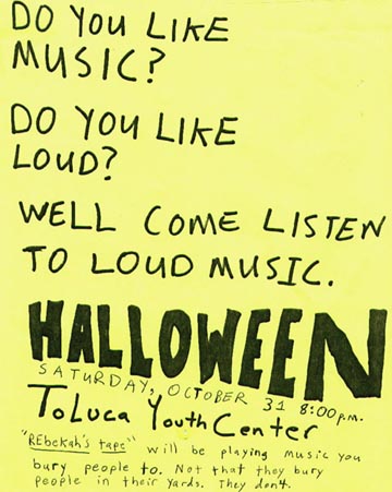 The above 2 flyers are from the first Rebekah’s Tape show. We were still in high school. People laughed at Randy being on the flyers, AS WE INTENDED THEM TO DO. The Toluca Youth Center is one big room having only a tiled ceiling to absorb the sound. Every other surface in the room just reflects it. At this time we were borrowing a huge 300 watt guitar amplifier from our friend Tyler. We blew a speaker in it either before or after this event –we don’t remember. It made things very very VERY loud, when without the amplifier (at previous Lotkap shows) everything was just “very” loud. Dustin/Mike/Randy played a bunch of silly covers, then basically all of the songs from “is Happy Happy Haps” were played by Shawn/Mike/Dustin. “Cowspit” and “Falling Down The Stairs” from ‘Rebekah’s Tape’ were played also. The last song of the night was “Falling Down The Stairs”. 90% of this song has Shawn making preposterous feedback and noise. Whenever the speaker in Tyler’s amp was blown, it was blown while playing this song. Dustin lost hearing in one ear for approximately two weeks resulting from rehearsing this song one night in the basement. The jerk stood too close to the amp. Having it pointed at his face didn’t help either. For this song on this night Shawn brought another guitar/effects setup to add more sound. He spent a lot of the song stomping on a crappy heavily amplified and distorted guitar (one we named “porcules”-a combination of porcupine and hercules). Inevitably, yet mysteriously, there was much less than the original 25 people in the building at the end of the 20 minute song than at the beginning of it. Summary of show: loud. slappy. low-key. halloween.