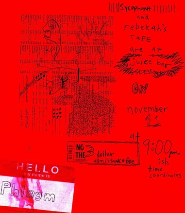 On this night our friend Dave handed out “HELLO my name is…” name tags. (“Phlegm” is an example) It was a pleasant additive to the enjoyment of the night. It was the usual rebekah’s tape/sycophant (fetal genius/rubdraw) juice bar show: wacky dancing, sweat,…phlegm. Rocko gave our 15 year old friend Trish an unannounced and uninvited shoulder rubbing this night. This was at the time that we still had Uncle Brian selling our stuff for us. We didn’t sell much back then. We later came to the conclusion that those two facts may have been interrelated.