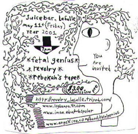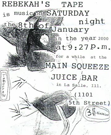 This is the first time we played IN La Salle. The Juice Bar was in its veritable heyday at this time. It’s crazy how many people showed up. The show started at 10:30 pm and we played for probably two and a half hours. At this time Dustin was not ‘officially’ a part of the group. Mike had a huge stomach ache. Cory was our friend at the time & he joined us very late in the set to play saxophone on “Tequila” (the pee-wee herman dance song). It was perhaps the liveliest few minutes of the night. At a Cancun show this last spring (2003) Mike ran into a guy who said the last time he saw rebekah’s tape was at this, their first, juice bar show. Mike apologized and meant it.